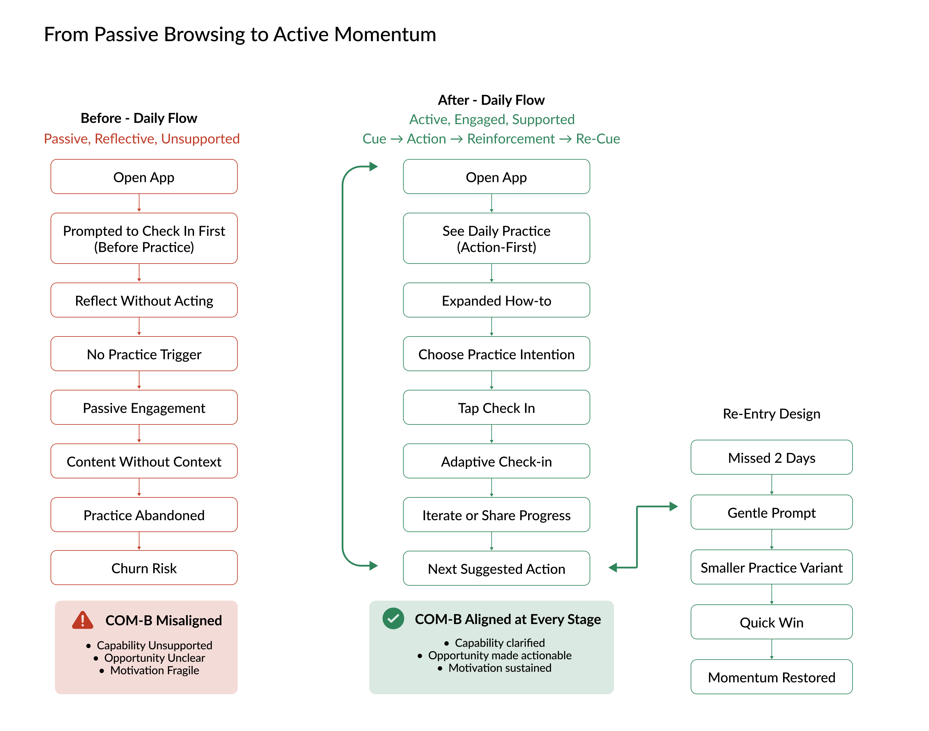 The redesigned flow shifts to an action-first daily loop that clarifies what to do today, supports practice in-context, and makes it easy to adjust and keep going.