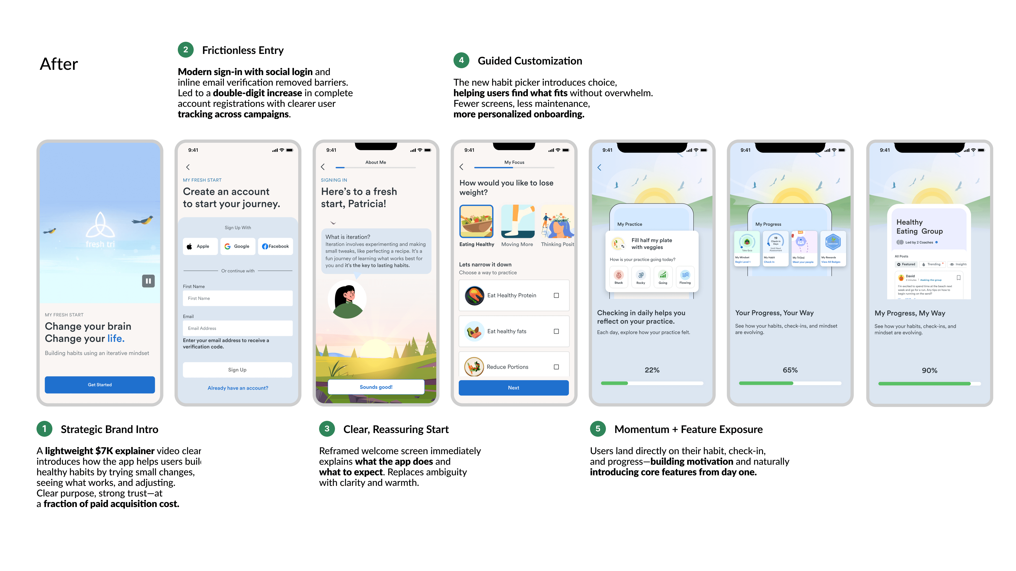 The original flow lost users early. We redesigned it to reduce friction, clarify purpose, and spark daily habit practice. The results were stronger activation, more conversions and longer long term retention.